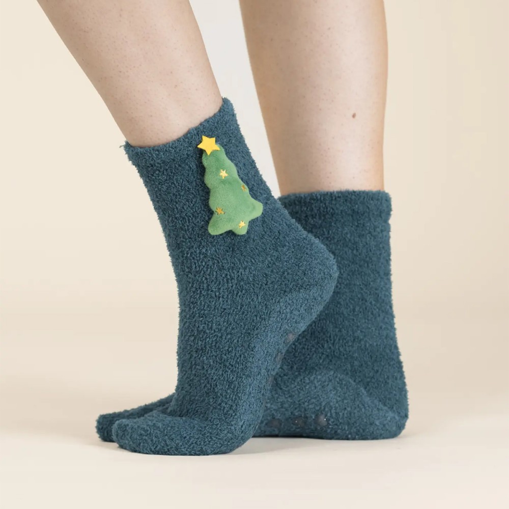 Tree Calzini Donna in Coral Fleece Antiscivolo con Applicazione Albero di Natale 3D | Idea Regalo