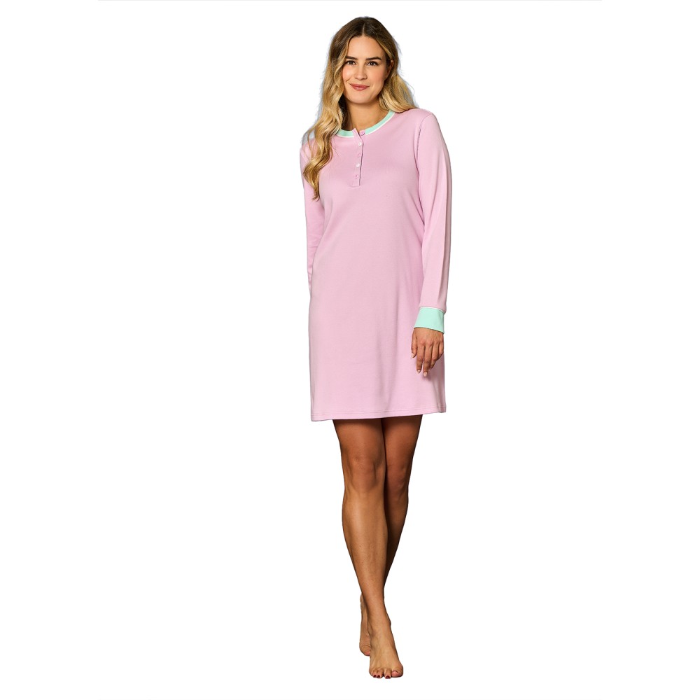 Questo abito casa donna Linclalor della linea Home&Smartwear è pensato per chi ama vestibilità comode e uno stile pulito e contemporaneo. Realizzato in tinta unita rosato, è rifinito con profili color acqua che ne valorizzano lo scollo a serafino con cinque bottoncini, creando un contrasto delicato ed elegante.