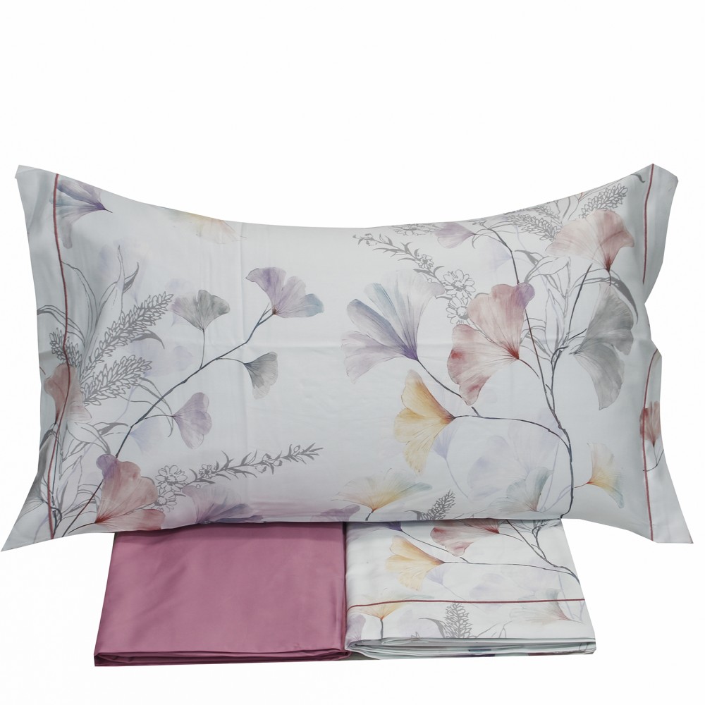 Elegante completo lenzuola matrimoniale lenzuolo-copriletto in raso di cotone 300 TC con stampa all over, bordo tinta unita e rifinitura coda di topo. Ideale per la stagione primavera estate.