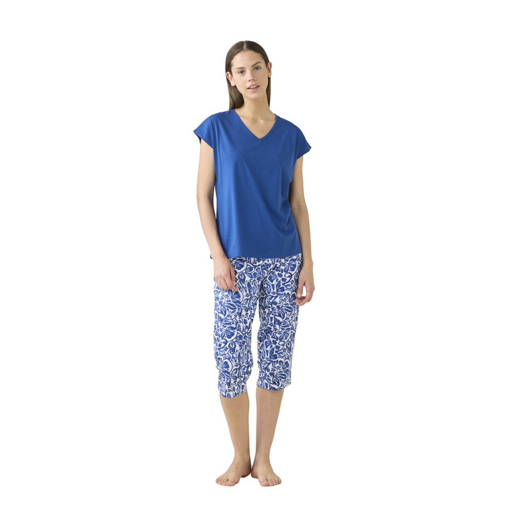 Pigiama estivo da donna con maglia a giromanica a tinta unita bianca e pantalone a 3/4 con stampa zebrata in viscosa.