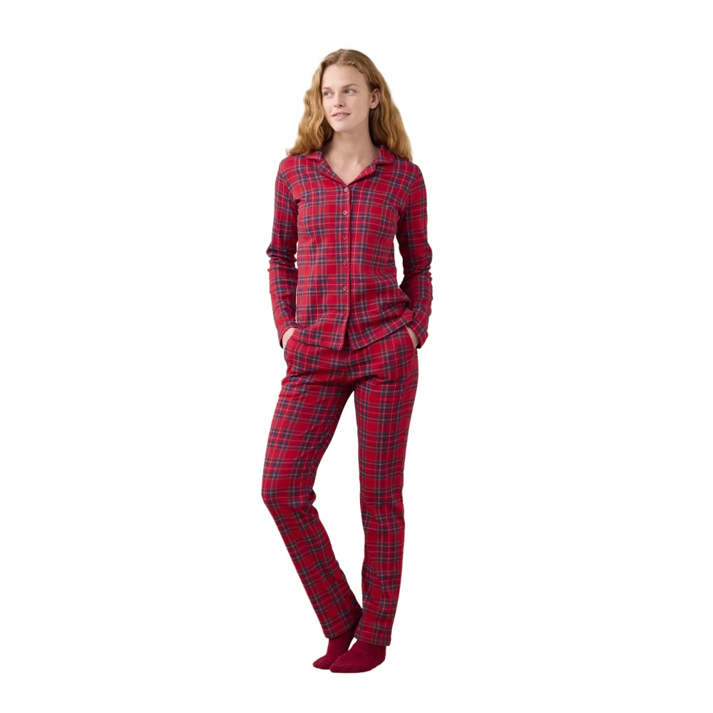 Pigiama donna in caldo cotone con taglio uomo. Top con colletto e apertura frontale, pantalone lungo con tasche e stampa cachemire su tutto il completo. Ideale per la stagione invernale.