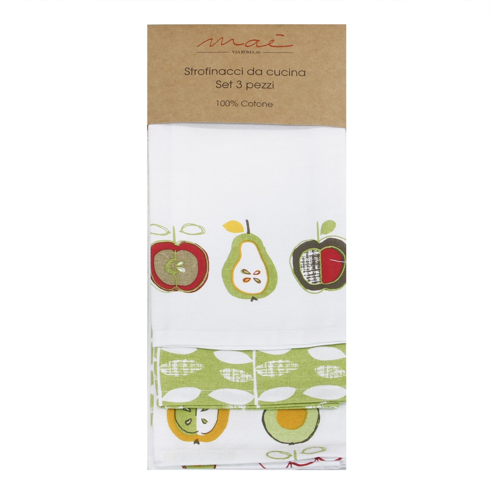 Un set pratico e decorativo composto da tre strofinacci assortiti in puro cotone: un mix di fantasie coordinate e texture diverse per portare colore e funzionalità nella tua cucina.