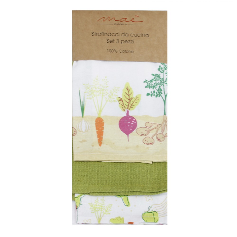 Un set pratico e decorativo composto da tre strofinacci assortiti in puro cotone: un mix di fantasie coordinate e texture diverse per portare colore e funzionalità nella tua cucina.
