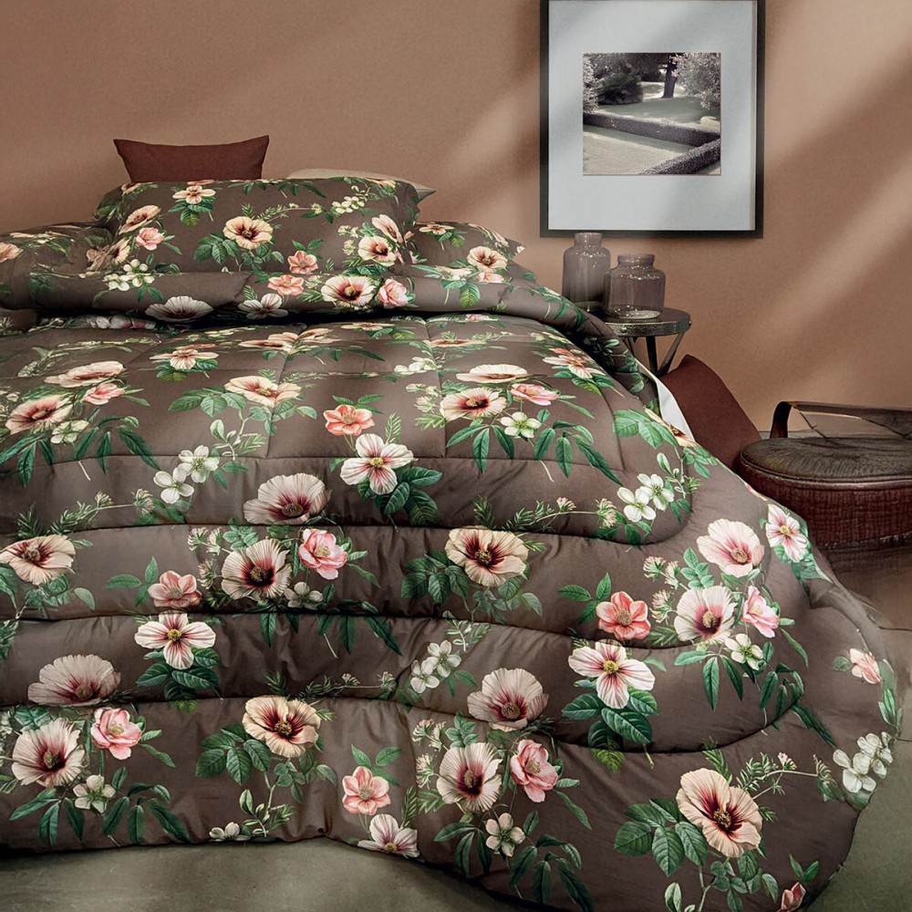 Trapunta in raso di cotone da 300 fili con stampa digitale. Trapuntatura piazzata a quadri con una cornice e chiusura con angoli tondi.
